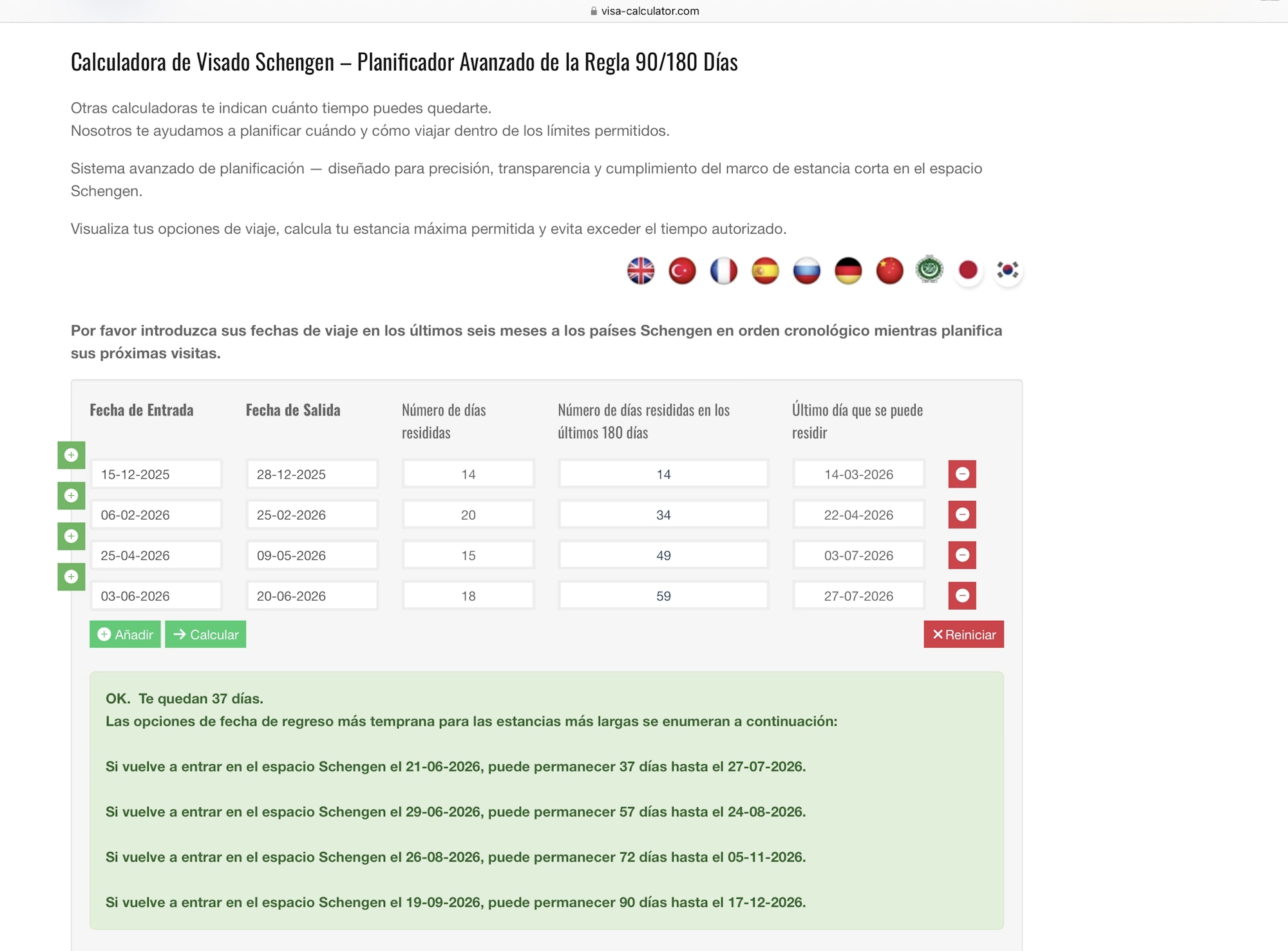 Ejemplo de cálculo con la Calculadora de Visado Schengen – Planificador Avanzado de la Regla 90/180 Días