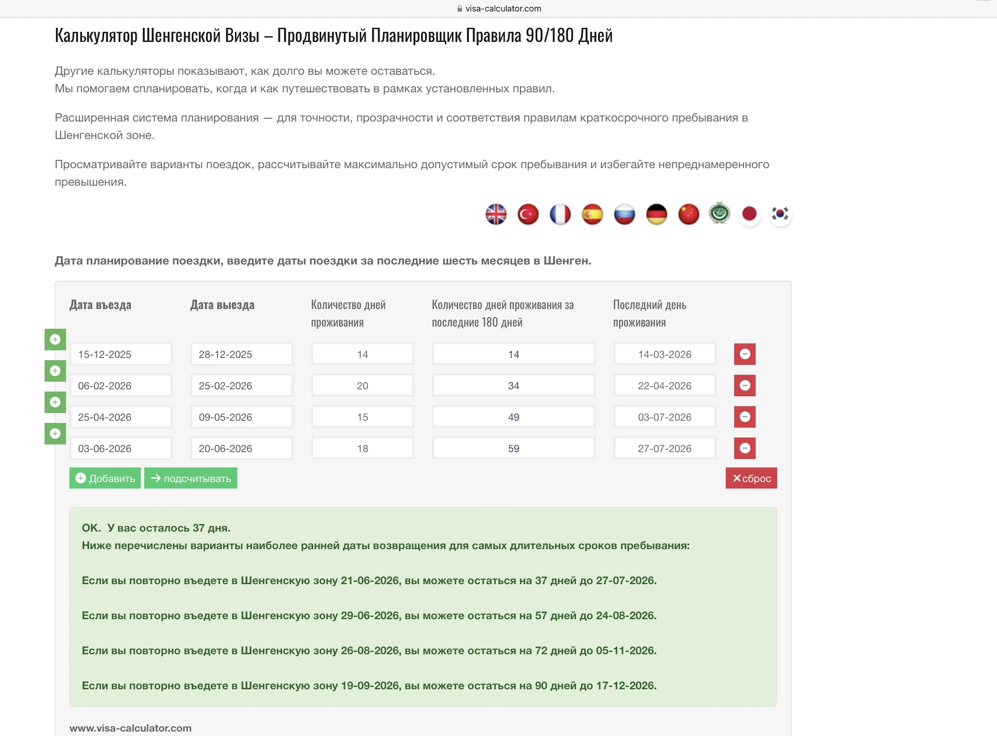 Пример расчета с использованием калькулятора шенгенской визы – продвинутого планировщика правила 90/180 дней